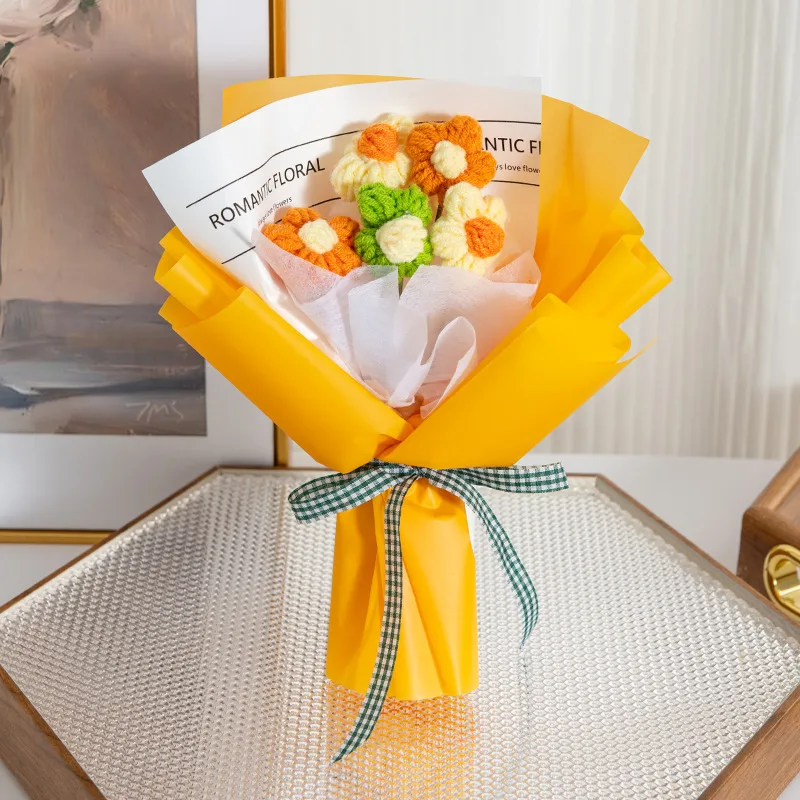 Cute crocheted five-flower bouquet, with multi-color packaging in blue/purple/yellow, etc., paired with plaid ribbons and romantic cards, exquisite and lovely~